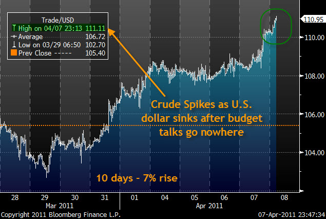 Just look at what happened when the meetings over the budget ground to a halt last night. The dollar plunged and markets around the world exploded to the upside. Even after the Nikkei futures pointed to an open off by almost 1%, equities came roaring back on the heels of cheap money getting cheaper by the tick.